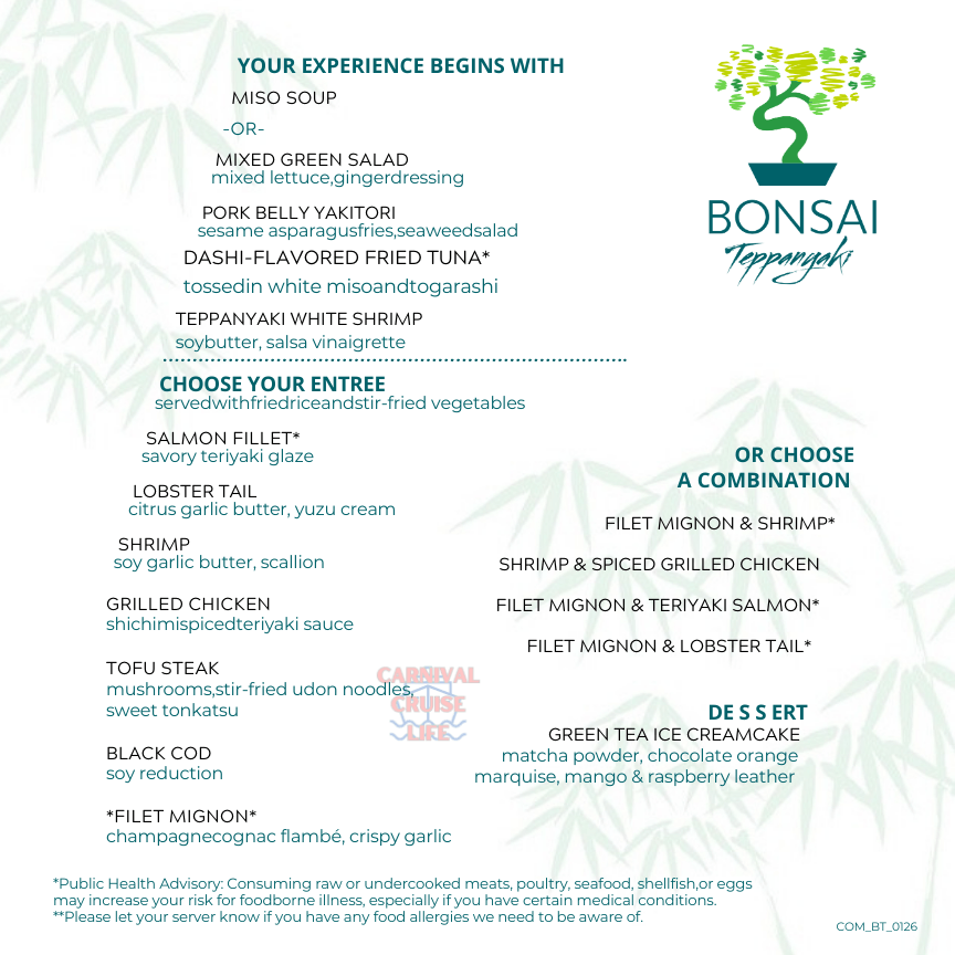 In true teppanyaki tradition — and with Carnival’s signature fun — the experience is interactive, lively, and full of surprises, blending bold flavors with playful moments that make every seat the best seat in the house.