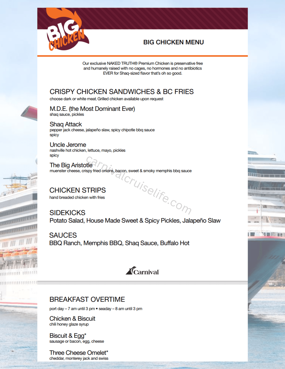 Bringing his love for great food and bold flavor to the ocean, Shaq introduces Big Chicken — a restaurant as legendary as the man himself. Whether you’re craving lunch or dinner, you’ll find mouthwatering chicken sandwiches, crispy strips, and juicy fried chicken baskets, all served with tasty sides like potato salad and jalapeño slaw.