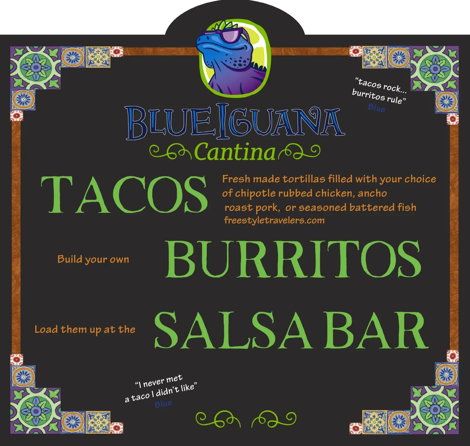 No one knows Mexican flavors quite like our BlueIguana — and you’ll taste the difference! At the BlueIguana Cantina™, you can enjoy freshly made tacos and burritos filled to perfection, just the way you like them. Add in our warm homemade tortillas and zesty salsas, and you’ve got a laid-back dining experience that’ll have you saying “mmm”… which in Iguanese translates to “more, please!”