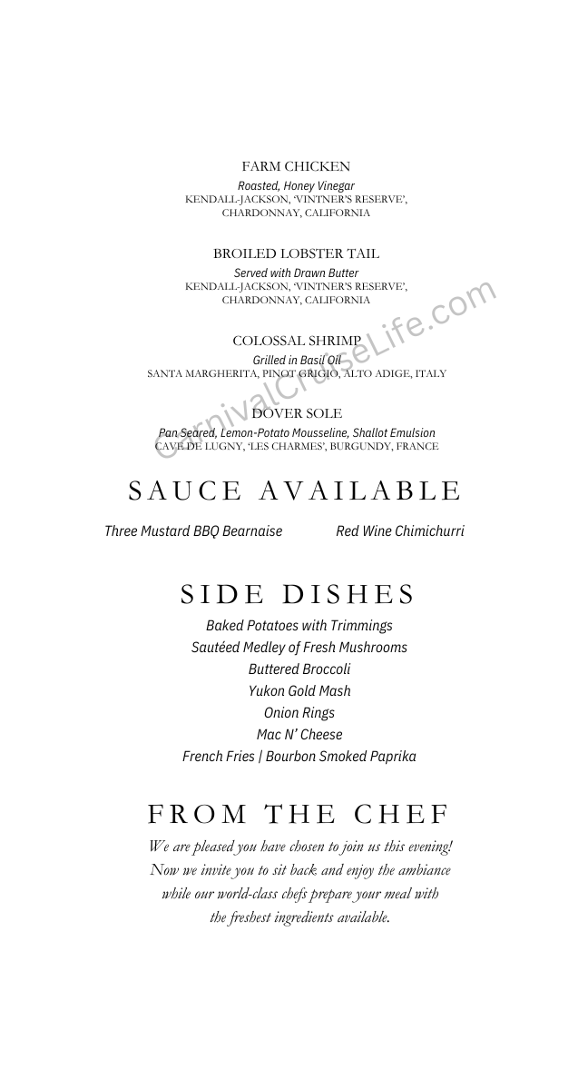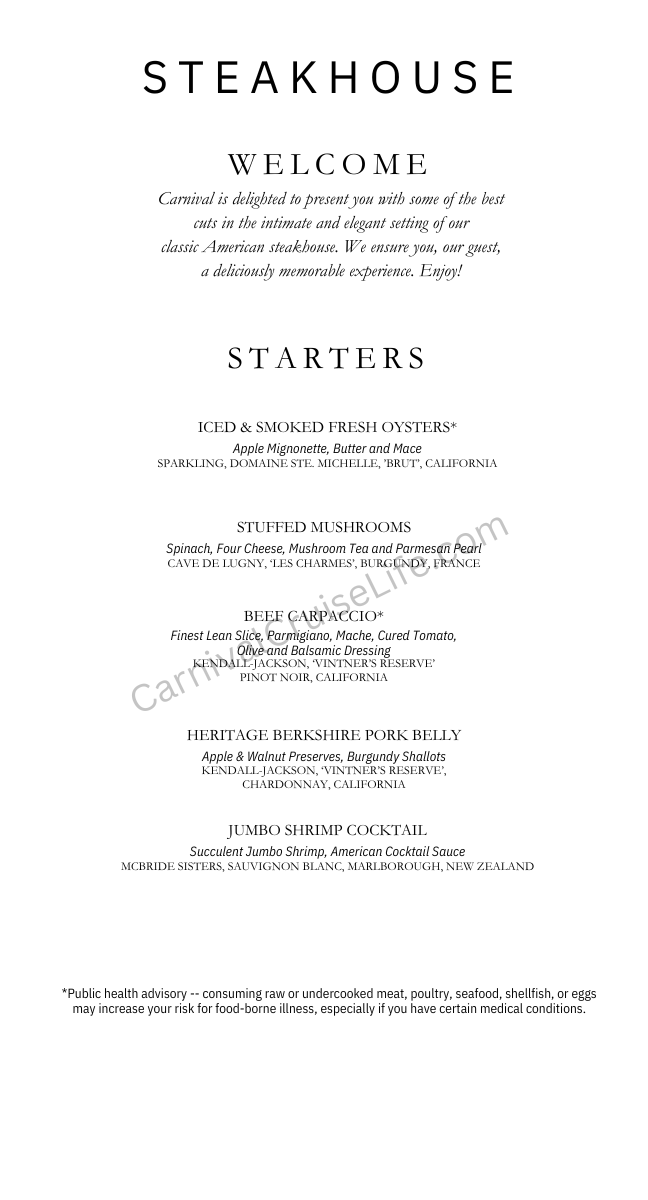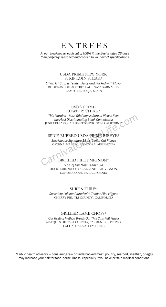 Elevate your vacation with an evening of exceptional flavor at Carnival’s onboard Steakhouse — where every bite feels like a celebration. Indulge in perfectly cooked, premium cuts of beef prepared just the way you like them, alongside exquisite seafood, gourmet appetizers, and an award-winning wine list recognized by Wine Spectator for its excellence. The warm, elegant atmosphere complements each dish beautifully, creating a dining experience that’s as unforgettable as your time at sea.