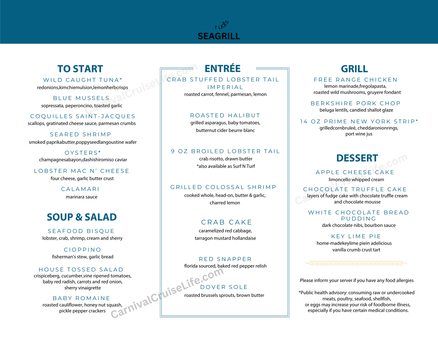 At Rudi’s, the menu is a celebration of the sea itself. Indulge in refined courses like rich seafood bisque or the signature crab-stuffed lobster tail imperial, each dish presented with an elegance that honors the ocean it came from. Every bite is a tribute to the flavors, beauty, and joy the sea provides—making an evening at Rudi’s Seagrill not just a meal, but a true cruise highlight.
