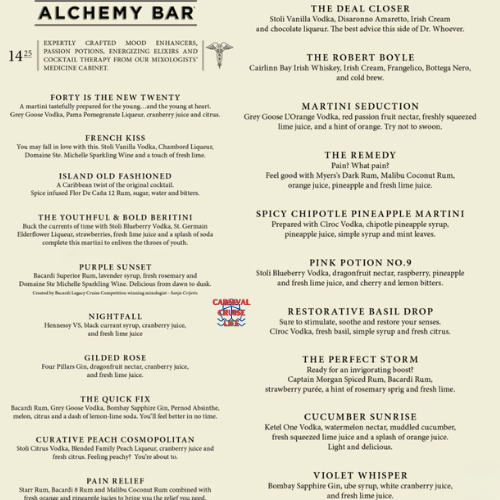 The Alchemy Bar is one of the most popular cocktail spots onboard β arrive early or with a Cheers drink package to skip lines.
